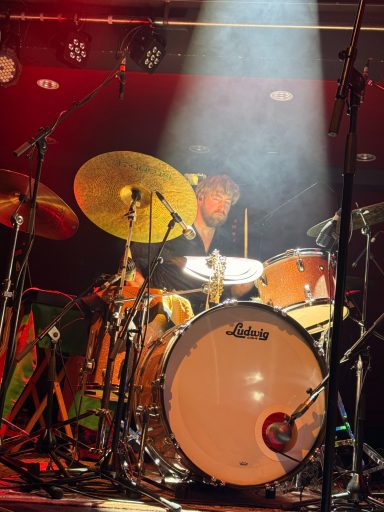 Glasshouse Two proved to be exactly the right room, cosy and intimate, with comfortable standing space that was busy but still enough space for a shimmy. The seated rows were full, locked in, heads nodding, eyes fixed. The stage was efficient and playful with a small carousel horse, a chair with a ghetto blaster, and a few signs, just enough to echo the ‘Metalhorse’ world without drama.